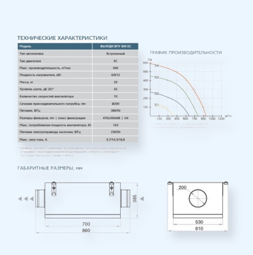 Установка имеет энергоэффективный ЕС – вентилятор. В нем отсутствуют тепловые потери, что позволяет достигать более высокий КПД - 80–90 %. Плавное и глубокое регулирование оборотов, обеспечиваемое EC-двигателями дает значительный эффект в части снижения суммарных значений потребляемой мощности.
